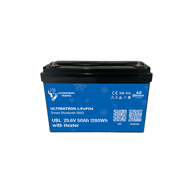 Bateria litiu LiFePO4 25.6V 50Ah Ultimatron cu BMS inteligent, Bluetooth și sistem de încălzire integrat este soluția ideală pentru utilizare în medii reci și aplicații 24V.